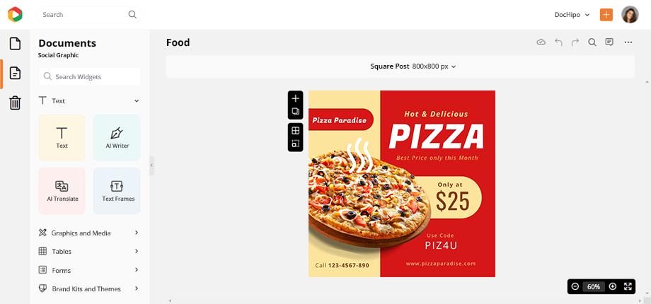 Leverage the power of DocHipo, a free graphic design software, to turn your ideas into beautiful designs. With thousands of premade templates, an intuitive drag-and-drop editor, a real-time collaborative experience, and integration with popular tools make DocHipo the perfect choice for business users and non-designers.