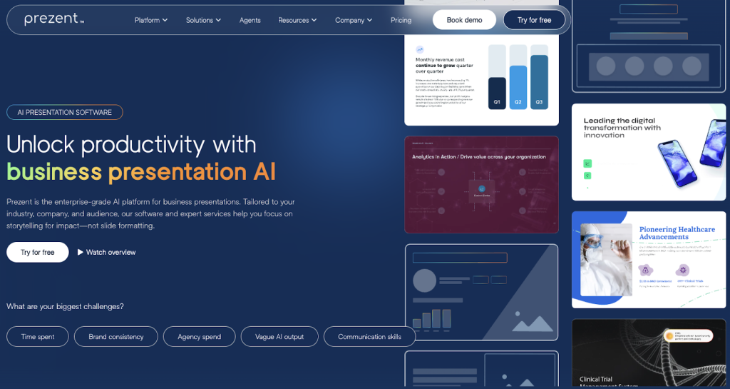 Prezent is an AI-powered enterprise presentation software built to help professionals create high-quality, brand-aligned slides in minutes. It’s trusted by Fortune 2000 companies and fast-growing startups for crafting investor decks, business reviews, and executive presentations. With its intelligent AI assistant, Astrid, Prezent understands your brand, industry, and audience to generate polished presentations tailored to your context.