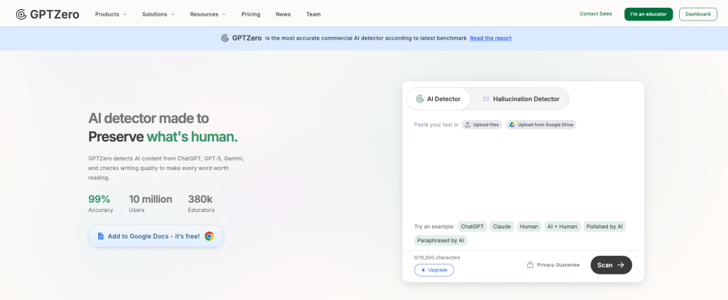 As a most advanced AI detector, GPTZero consistently outperforms most alternatives when it comes to accuracy. It was one of the first tools in this space, launched back in January 2023 by a Princeton student, and that head start shows. The thing’s been trained on millions of documents, and it catches content from ChatGPT, Claude, Gemini, and pretty much every major LLM out there.