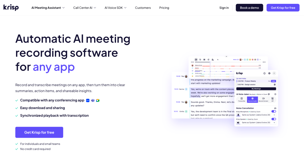 Krisp is an AI-powered tool that records meetings, generates transcripts, and creates smart summaries with action items—helping freelancers stay focused during client calls. Its AI Meeting Recording & Noise Cancellation ensures clear audio by removing background noise and echo in real time, making conversations more professional across Zoom, Google Meet, and Microsoft Teams.