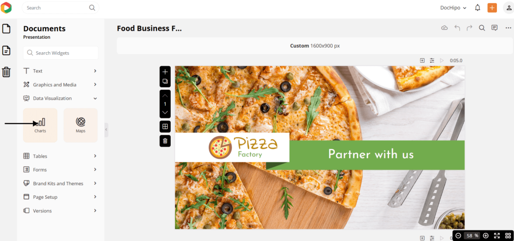 You can either explore desirable templates or take a blank canvas to enter the editor, where you can access the interactive chart maker. However, starting with a pre-designed DocHipo template gives you a quick headstart. From presentations, infographics, case studies, to social media content, videos, proposals, and other marketing collateral, you’ll get tons of options that will make your work easy.