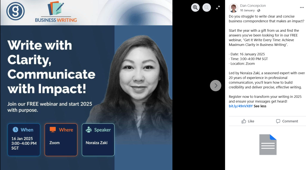 Here’s an example of a social media webinar post that has gained a promising number of likes for using a visual with faces that builds personality and credibility for the brand.