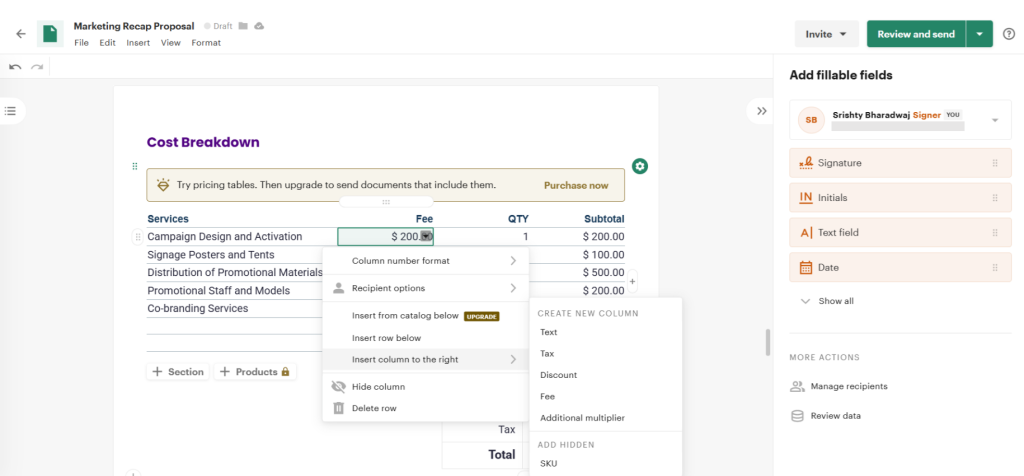One of PandaDoc’s strongest capabilities is its pricing and quoting functionality. It lets you add products or services from a catalog, automatically pull in details like unit price, quantity, taxes, discounts, and totals, and generate a clean, professional quote section.