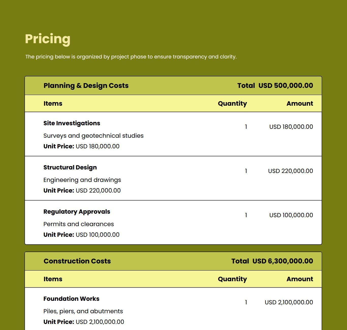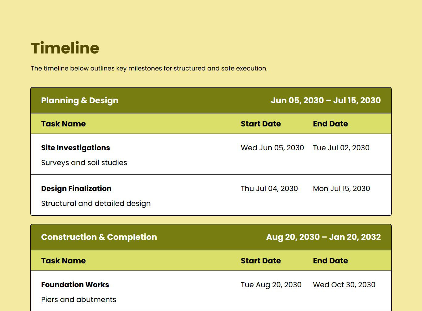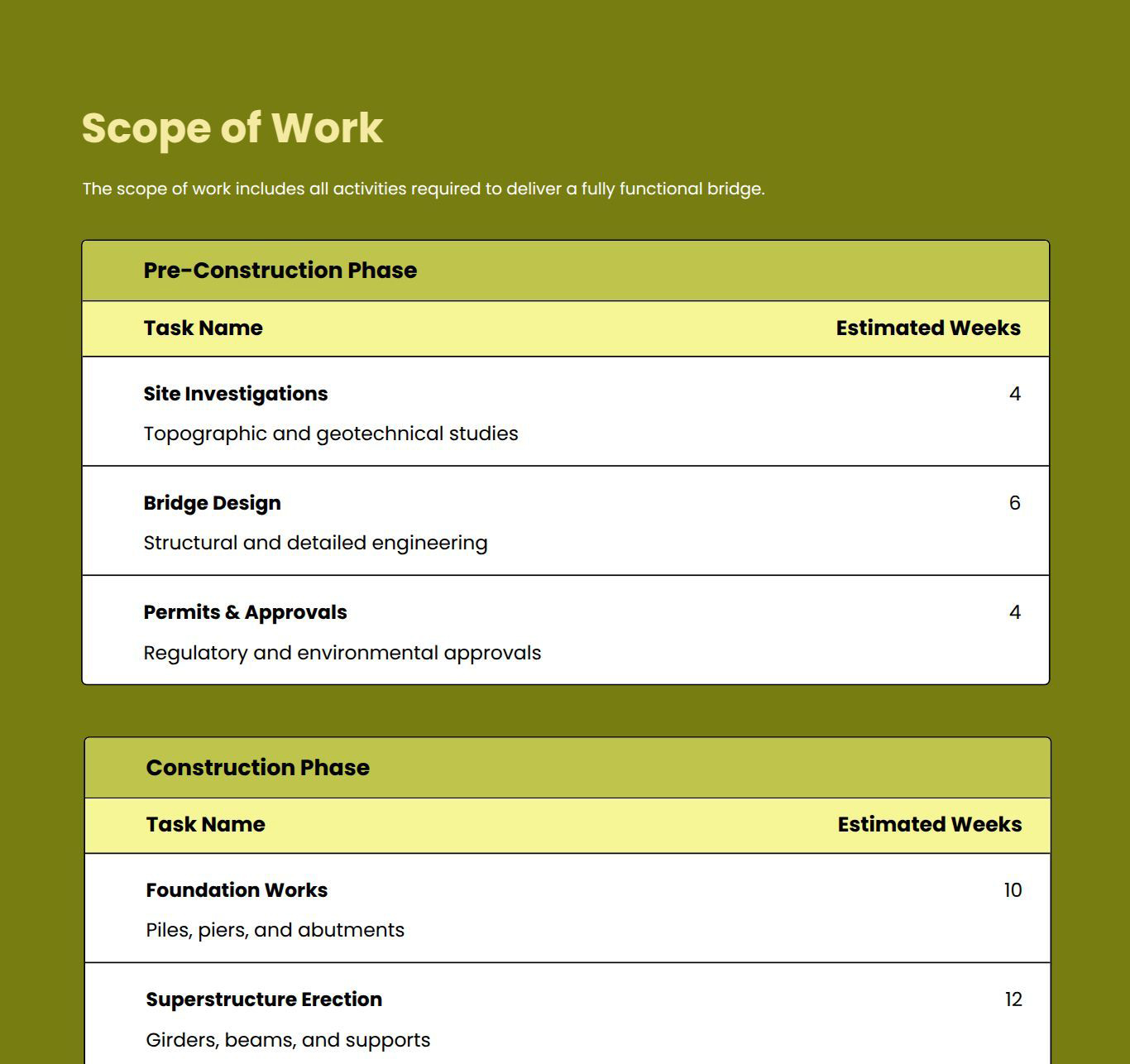 Use this bridge construction proposal template to present structured proposals for complex engineering projects. It helps you define scope, technical approach, materials, timelines, and pricing clearly. Easily tailor each section to meet project requirements and your brand identity.