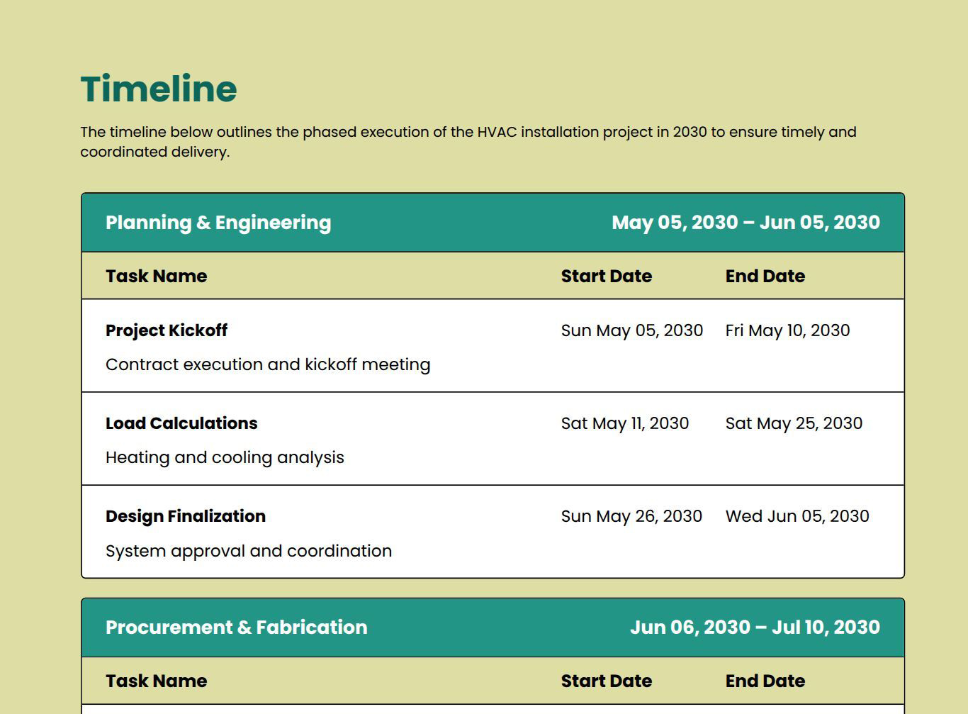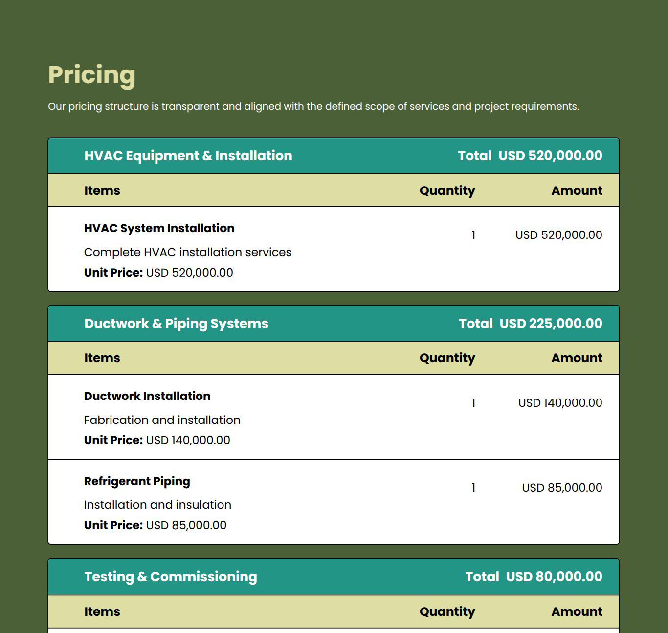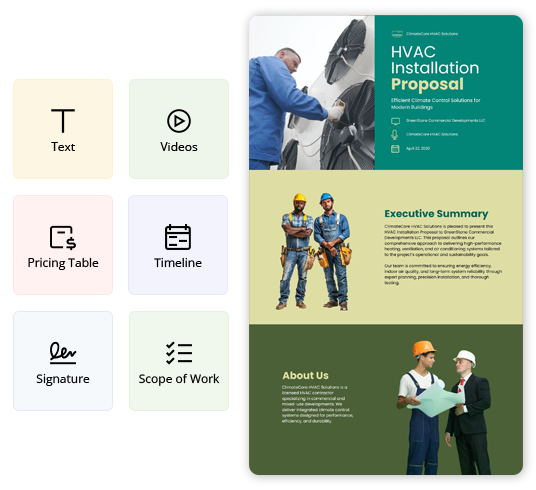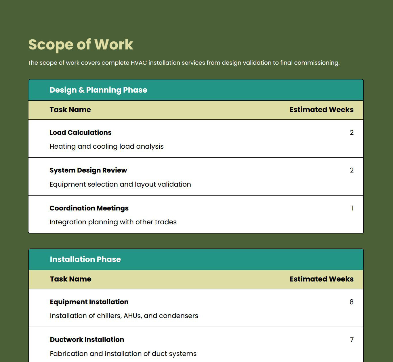 Use this HVAC installation proposal template to create professional proposals for climate control projects. It helps you define system scope, equipment, timelines, installation plans, and pricing clearly. Easily customize each section to match project needs and your brand.
