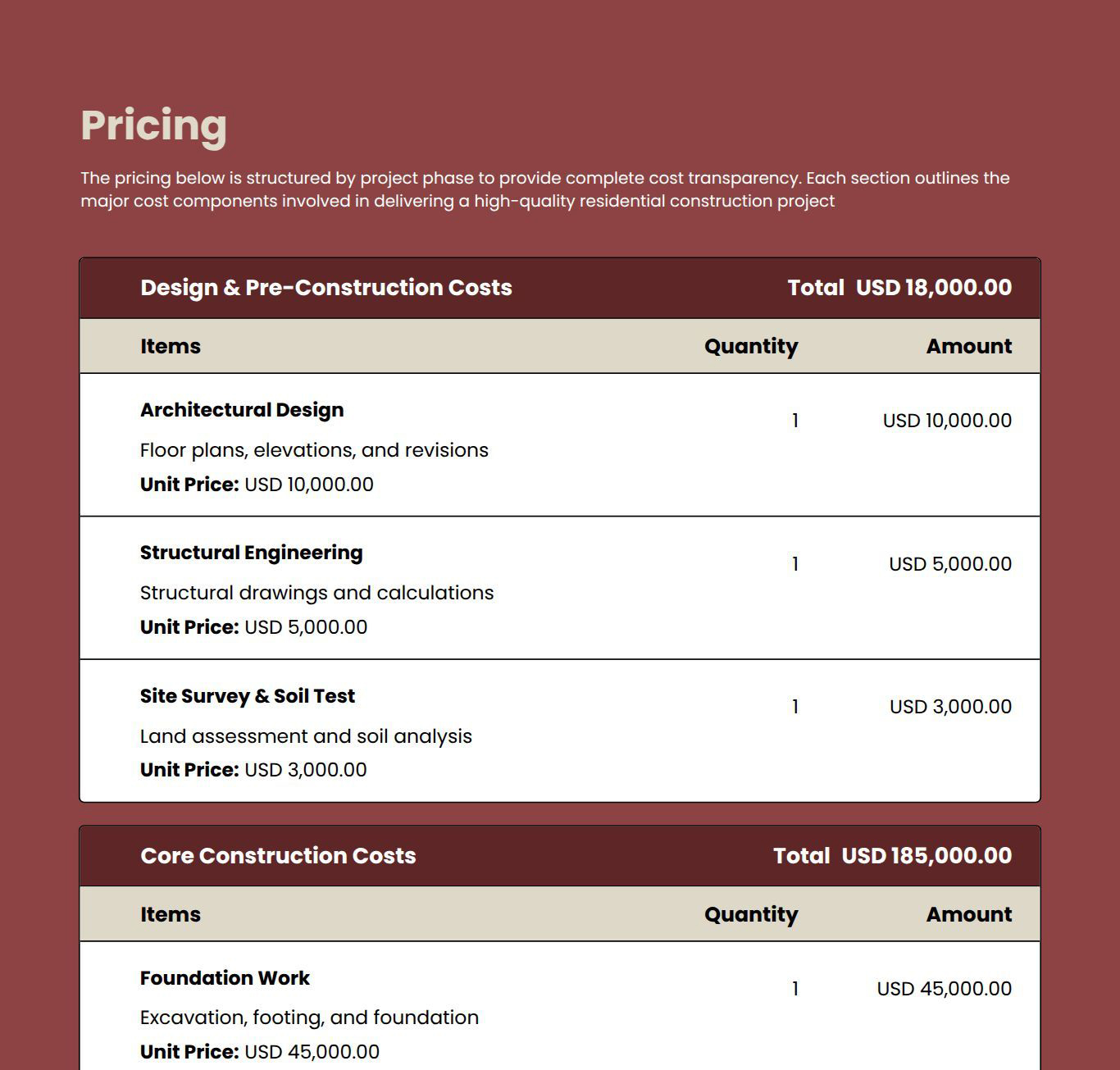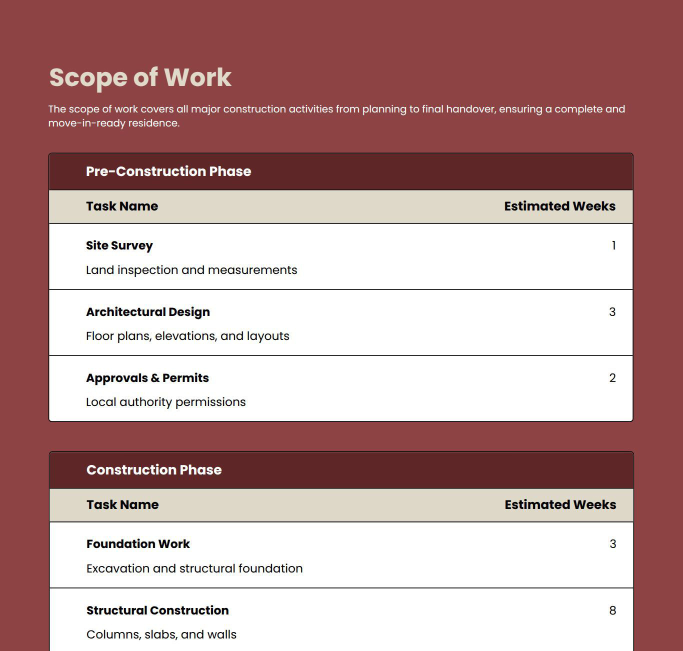 Use this residential construction proposal template to create clear, professional proposals for housing projects. It helps you define scope of work, materials, timelines, labor, and pricing in a structured, client-ready format. Easily customize every section to match client needs and your business branding.