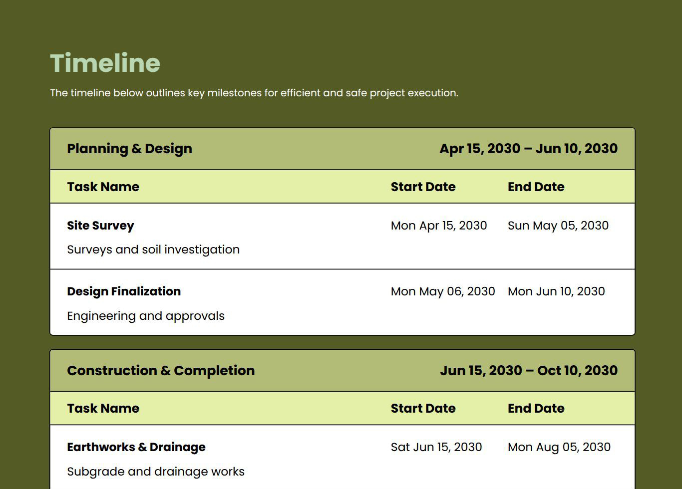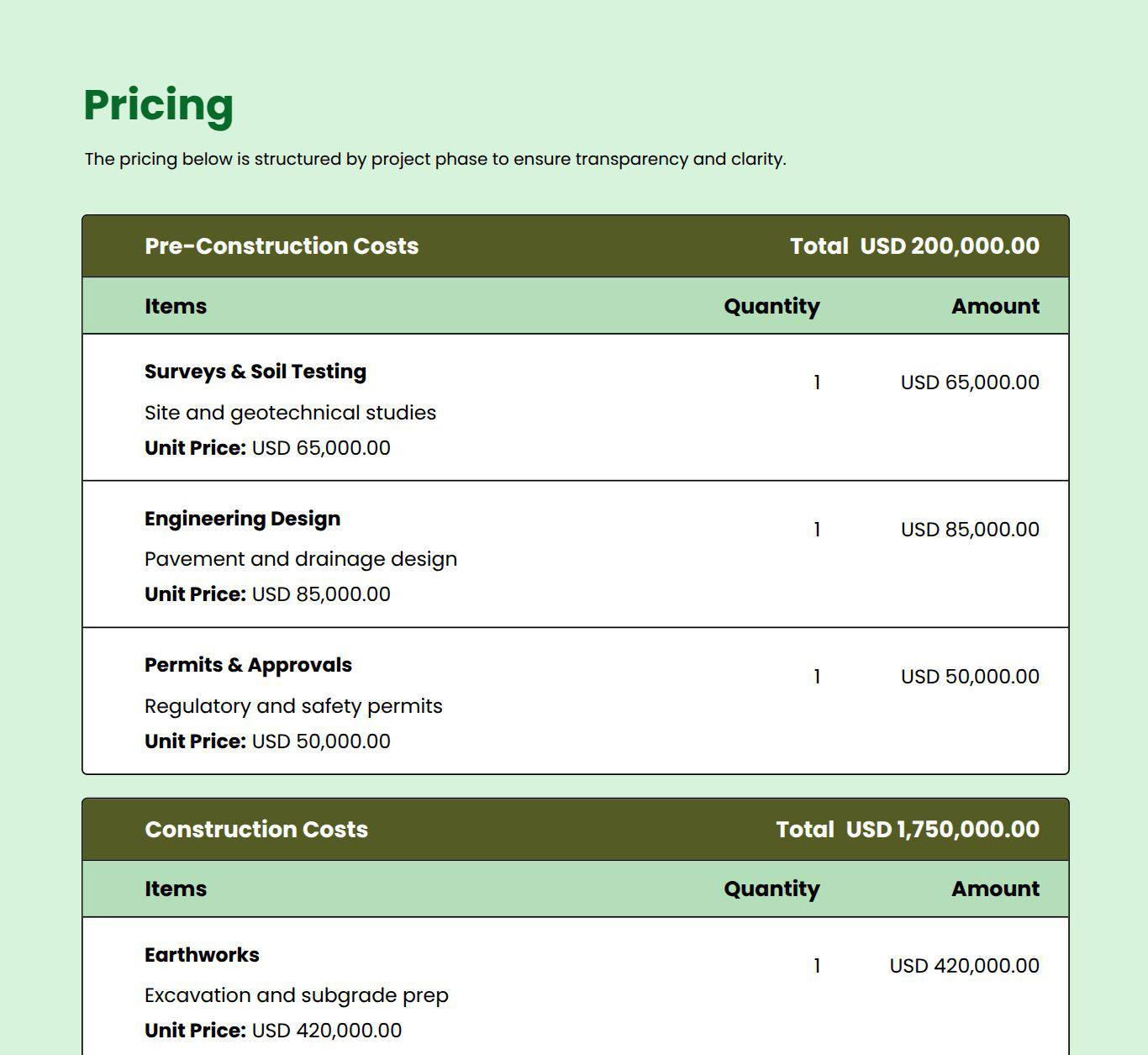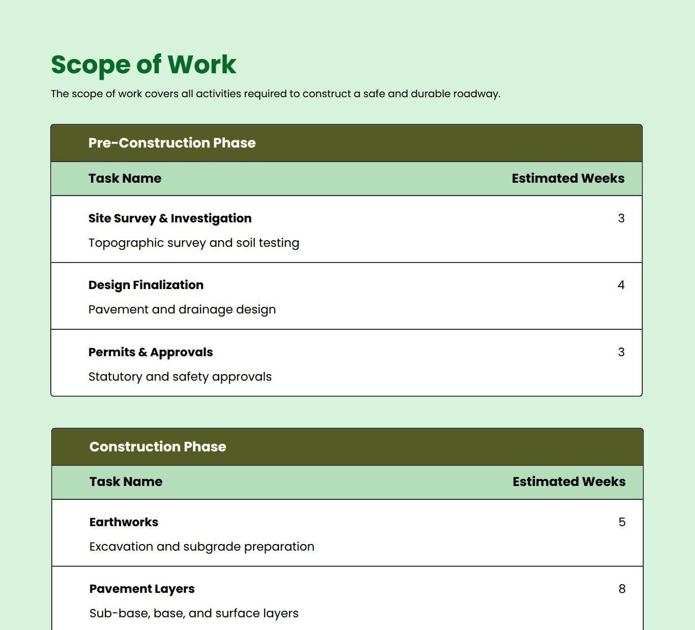 Use this road construction proposal template to create detailed proposals for infrastructure projects. It helps you outline scope, materials, equipment, timelines, and costs in a clear, professional format. Customize each section to suit project specifications and your branding.