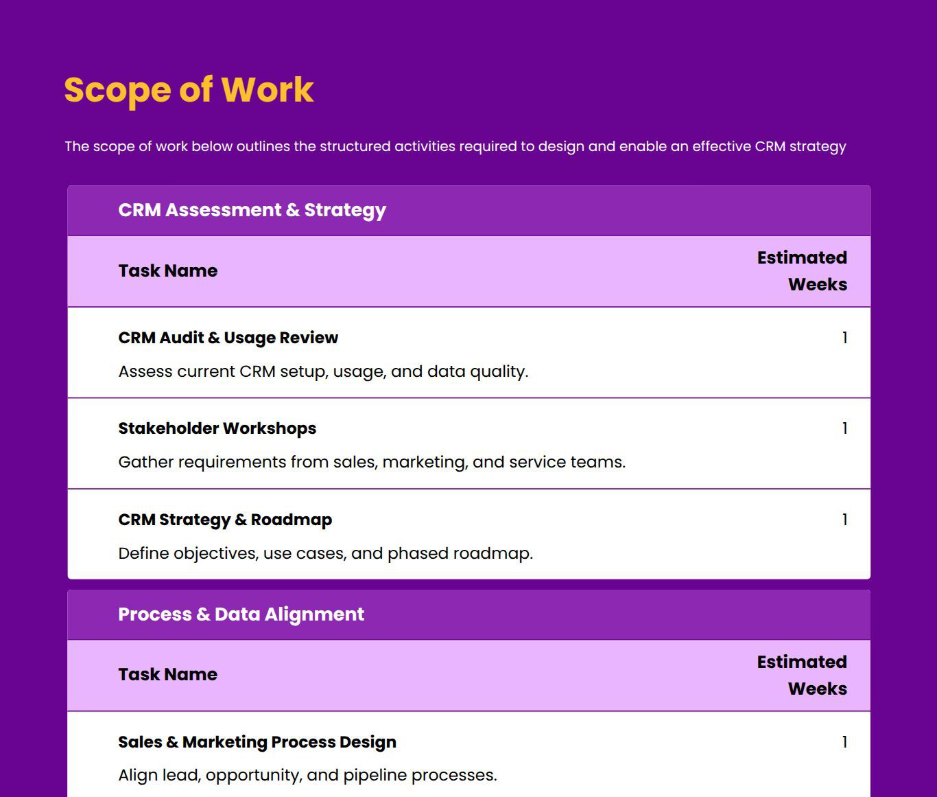 Use this CRM strategy consulting proposal template to create structured, professional proposals for CRM planning initiatives. It helps you define CRM goals, strategy, roadmap, timelines, and pricing clearly. Customize sections to align with client data, sales, and customer experience needs.