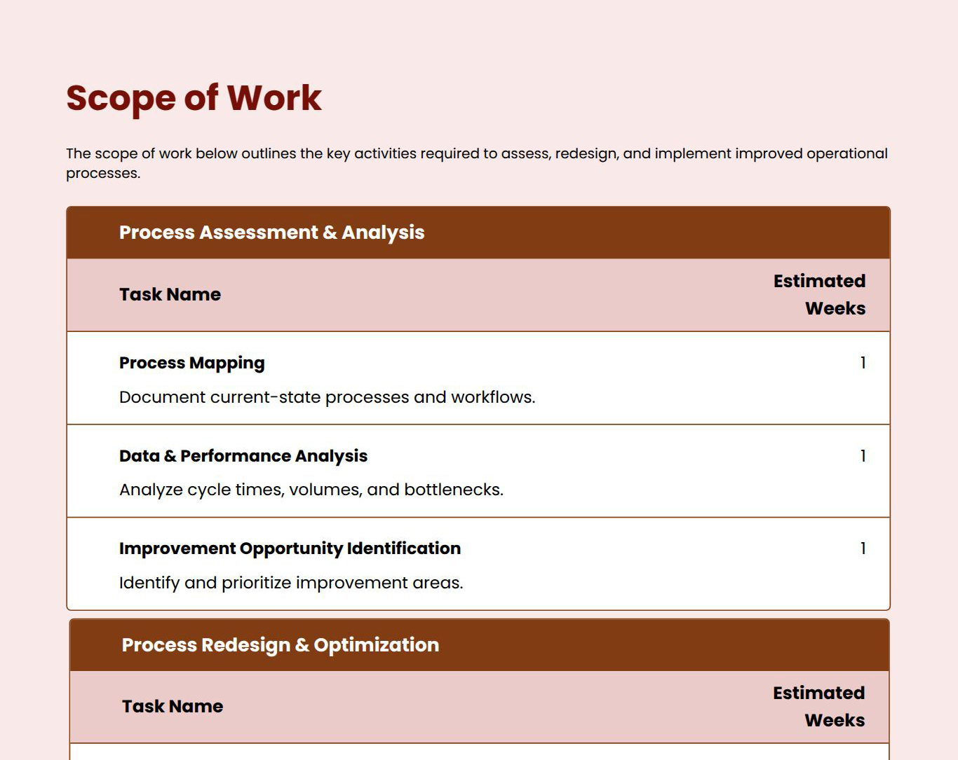 Use this process improvement consulting proposal template to create professional proposals for operational optimization projects. It helps you outline current gaps, improvement strategy, scope, timelines, and fees clearly. Customize each section to reflect client processes and efficiency goals.
