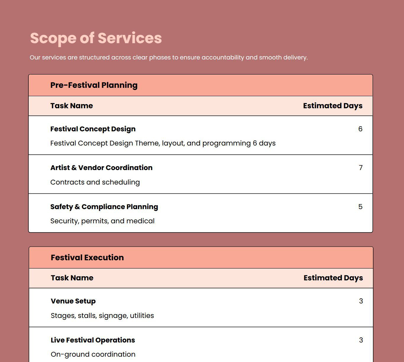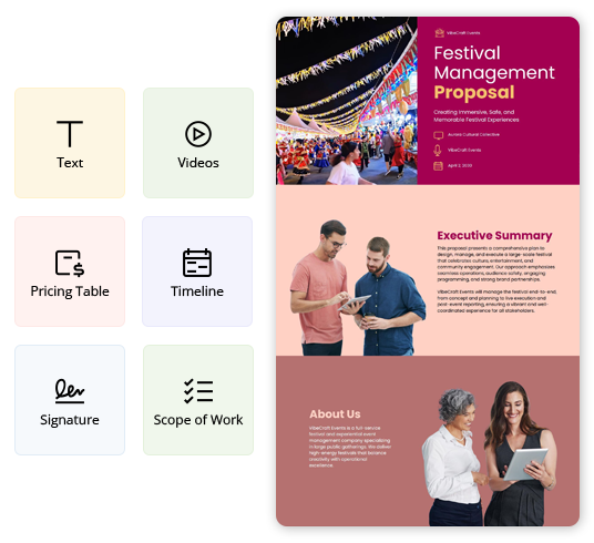 Explore more Events Proposal template examples designed for different offerings and client needs. Find the right example to match your service type and customize it quickly for your Proposals.