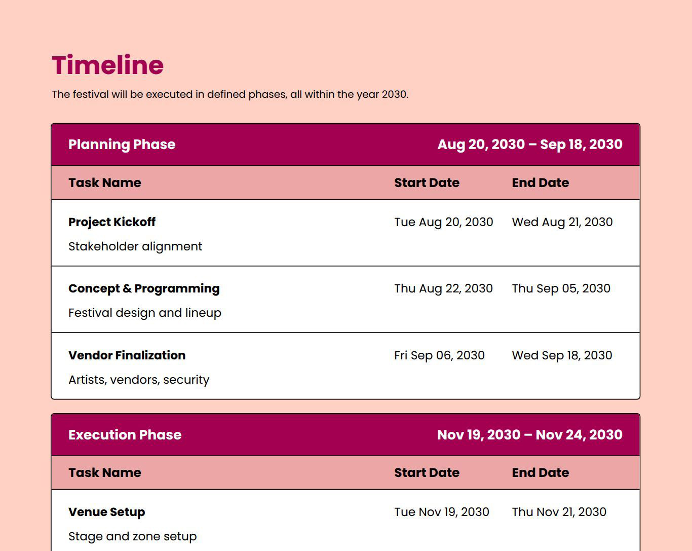 Use this festival management proposal template to present detailed proposals for multi-day events. It helps you define programming, vendor coordination, logistics, timelines, and budgets in a structured format. Easily customize sections to reflect the festival theme and your brand.