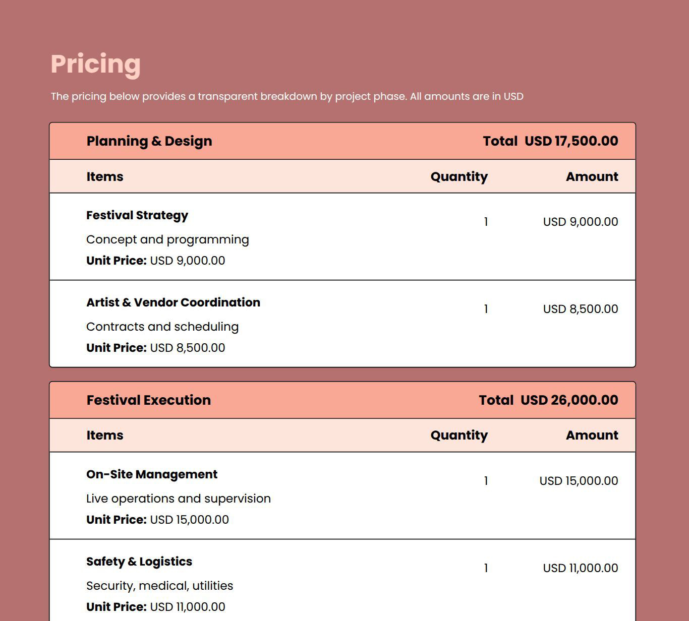 Create transparent, flexible pricing that clients can understand and approve without back-and-forth.
