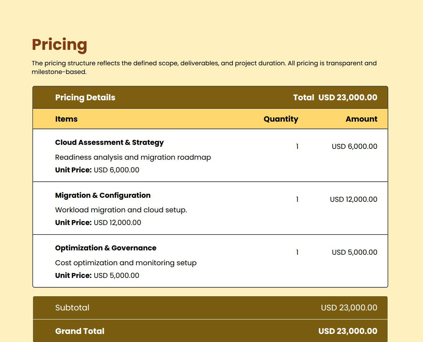 Use this template to present client needs, implementation scope, timelines, and pricing clearly in a professional, client-ready format.