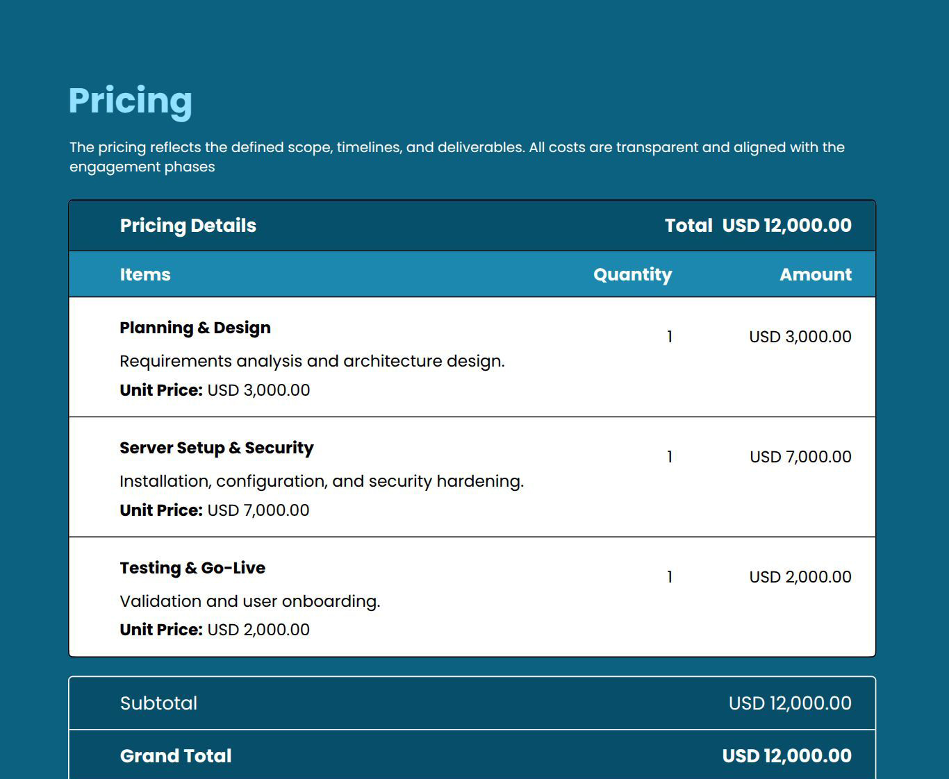 Use this template to present client needs, implementation scope, timelines, and pricing clearly in a professional, client-ready format.