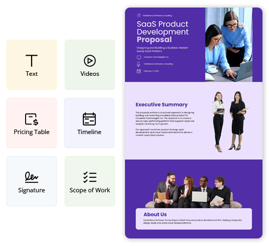 Use this SaaS product development proposal template to create structured proposals for SaaS initiatives. It helps you define product vision, roadmap, development approach, timelines, and pricing clearly. Customize each section to reflect client requirements and your SaaS expertise.