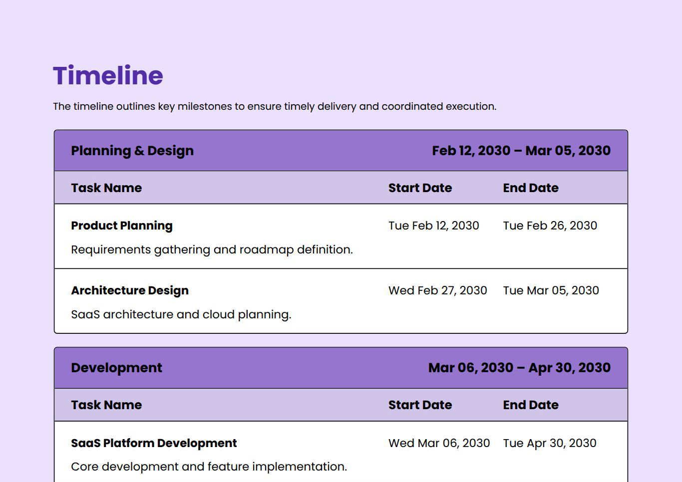 Yes, it includes sections for scope, timelines, milestones, and pricing.