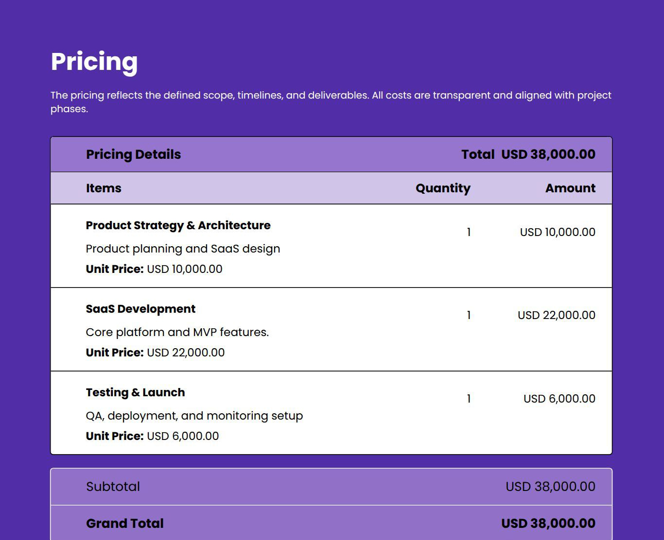 Use this template to present client needs, implementation scope, timelines, and pricing clearly in a professional, client-ready format.