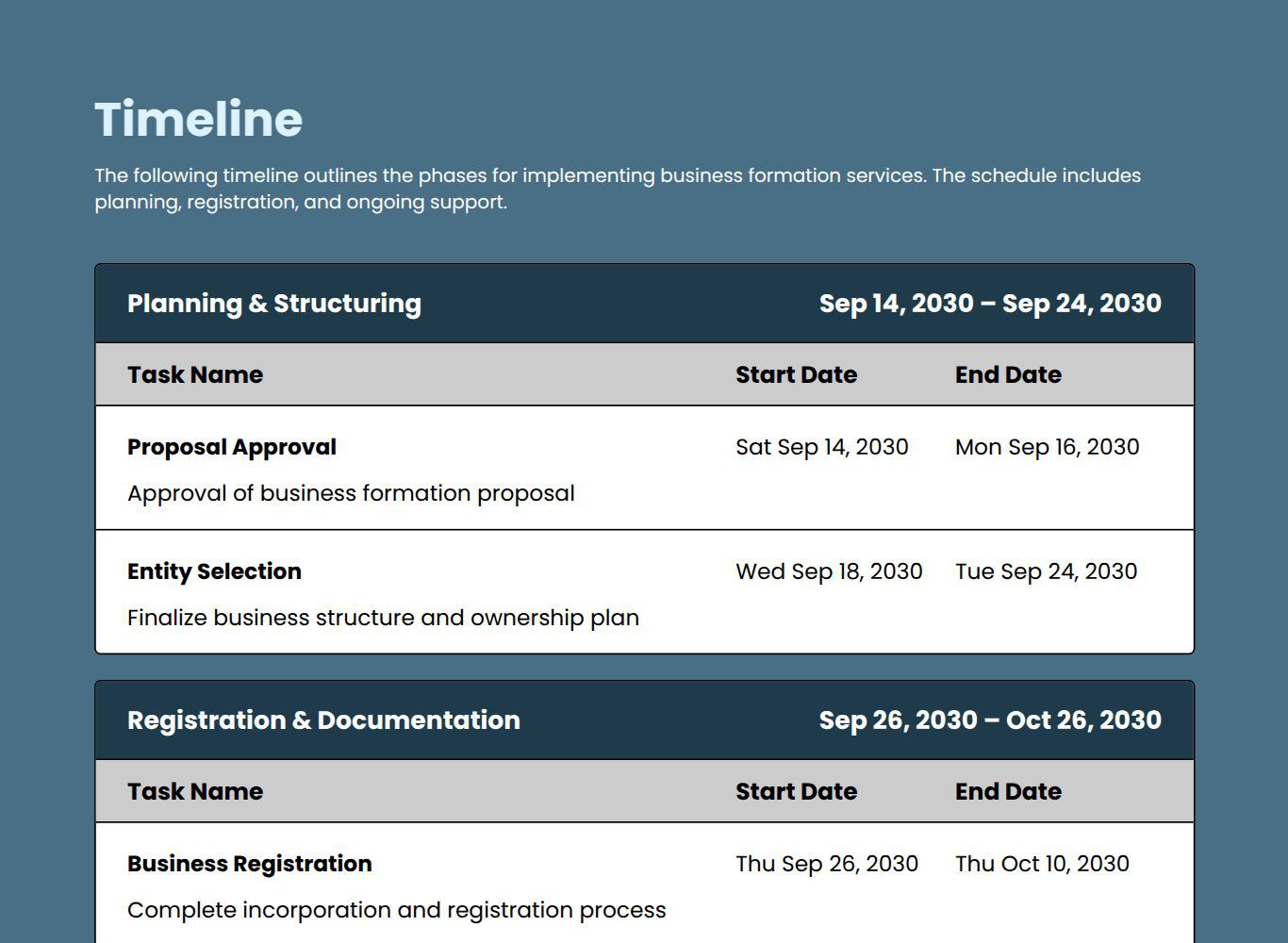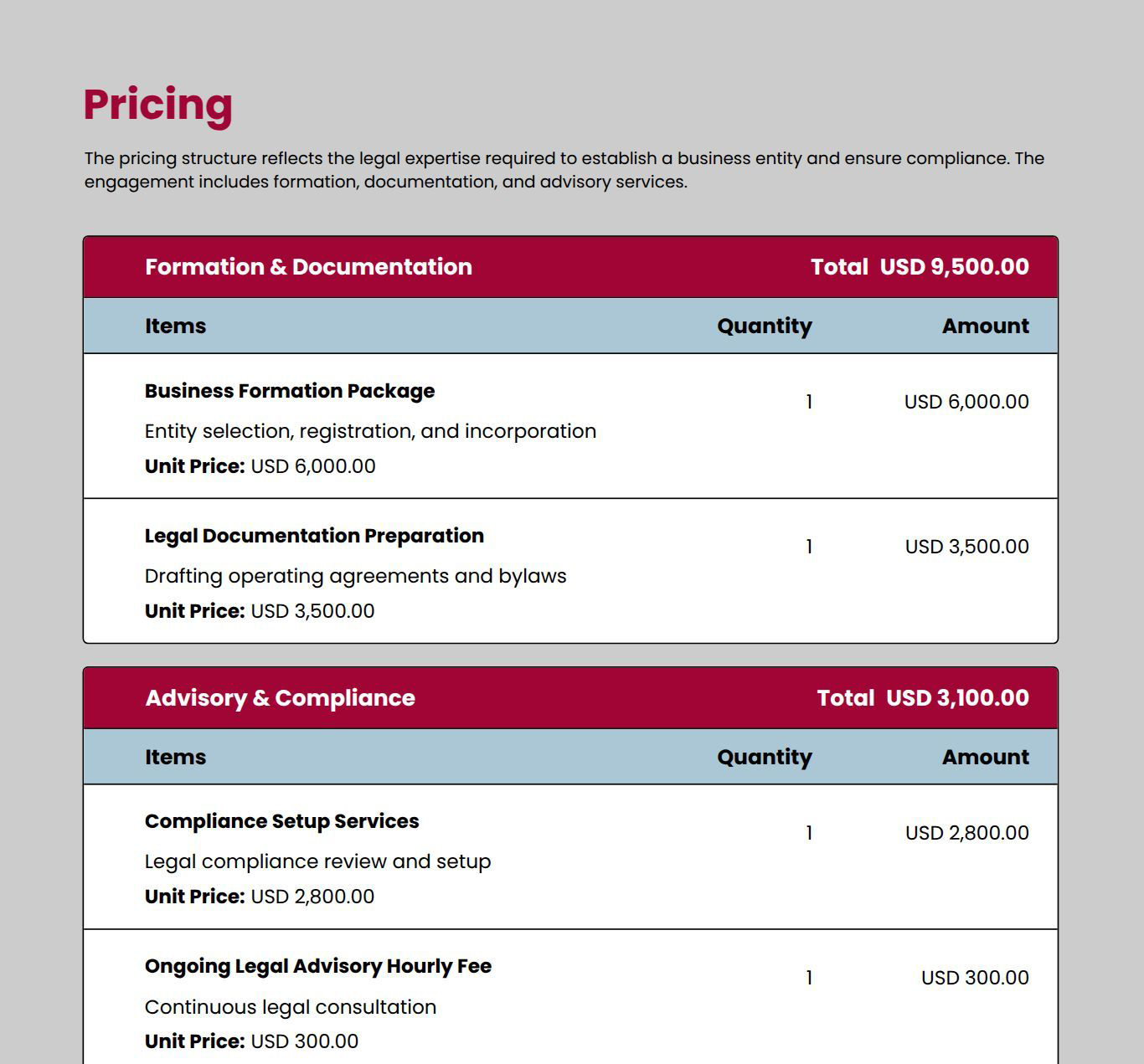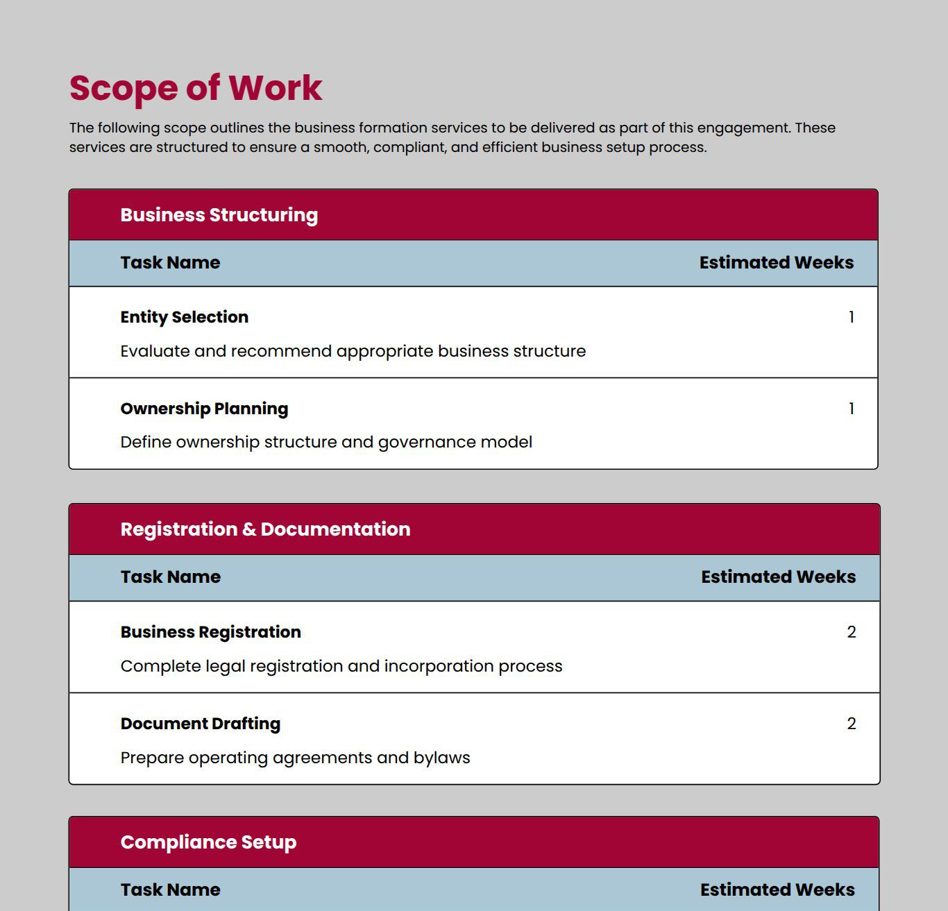 Use this business formation proposal template to create clear, professional proposals for company setup services. It helps you outline registration steps, legal requirements, compliance support, and pricing in a structured format. Easily tailor it to your client’s needs and branding.
