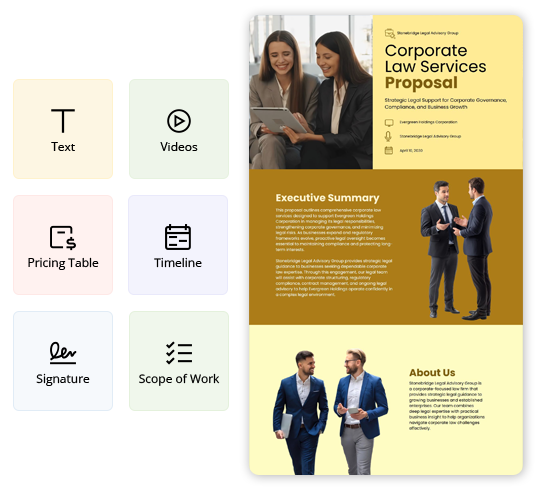 Explore more Legal Proposal template examples designed for different offerings and client needs. Find the right example to match your service type and customize it quickly for your Proposals.