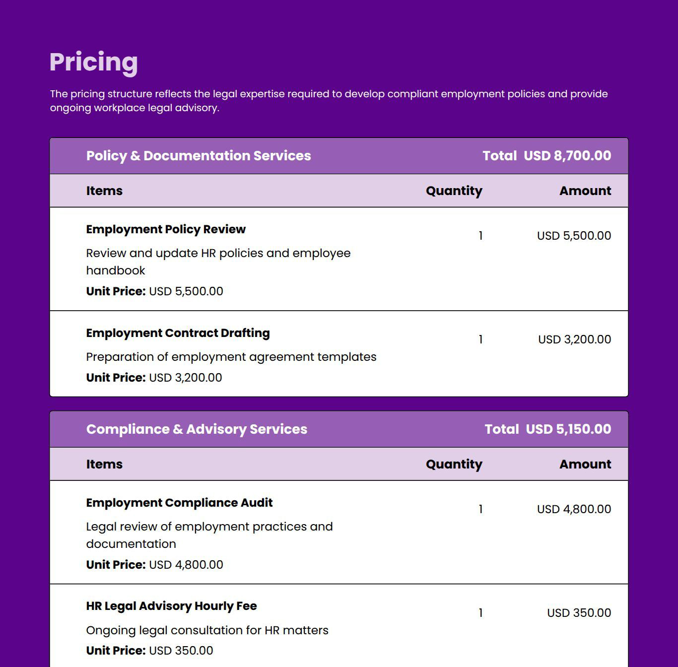 Use this proposal template to outline corporate legal services, compliance support, advisory scope, and pricing clearly.