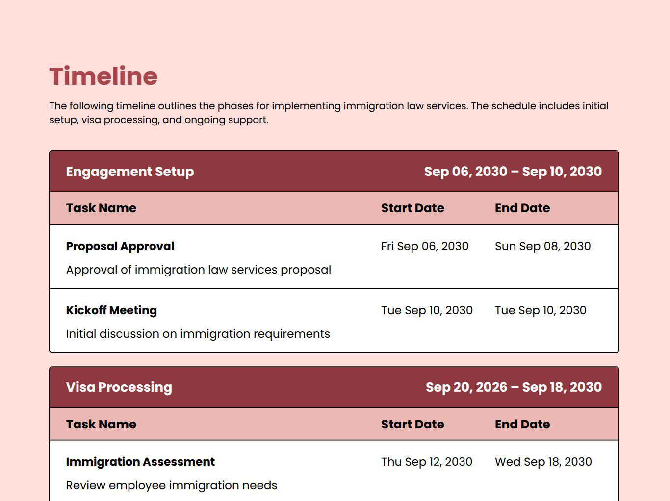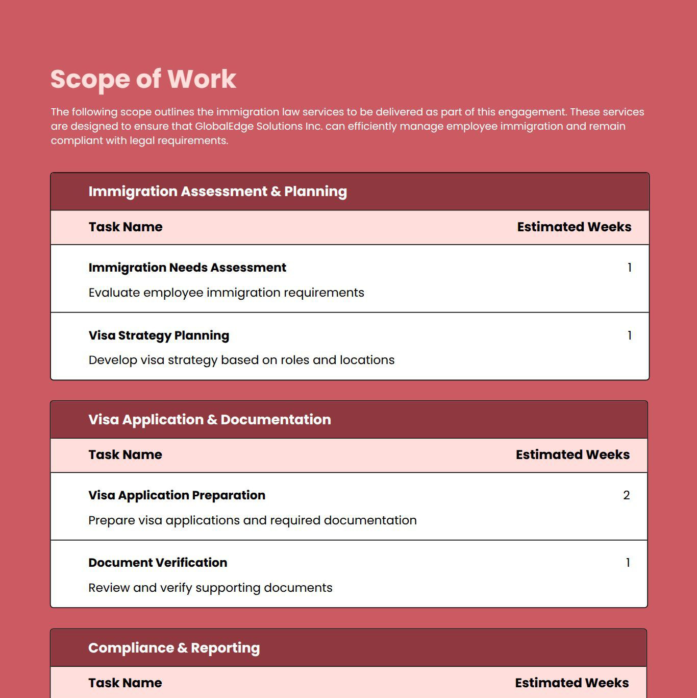 Use this immigration law proposal template to create clear, professional proposals for visa and immigration services. It helps you define application processes, timelines, documentation support, and fees in a structured format. Easily customize it for your client’s needs and branding.