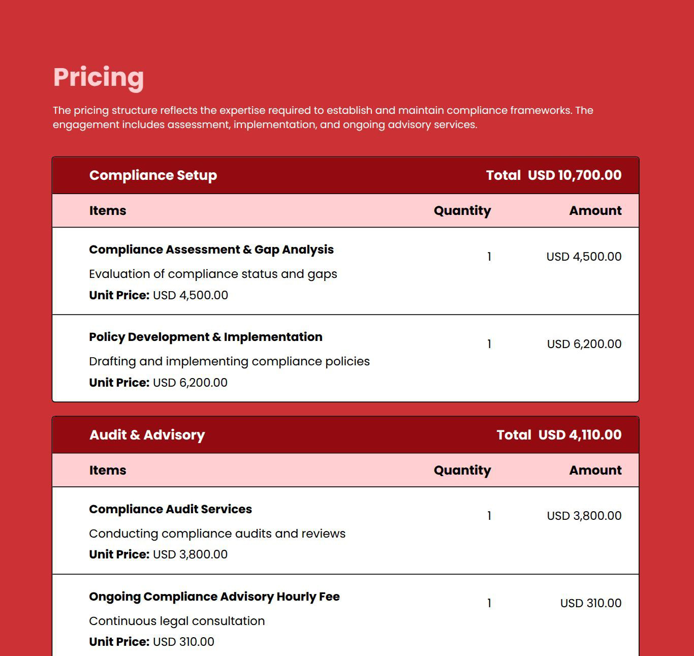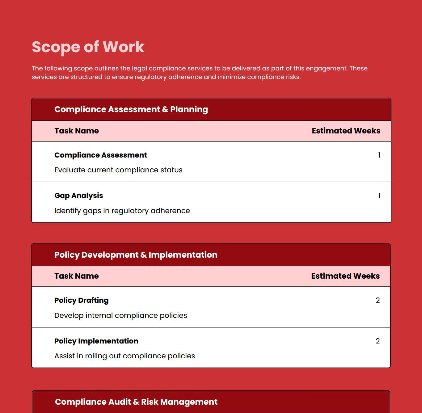 Use this proposal template to outline corporate legal services, compliance support, advisory scope, and pricing clearly.