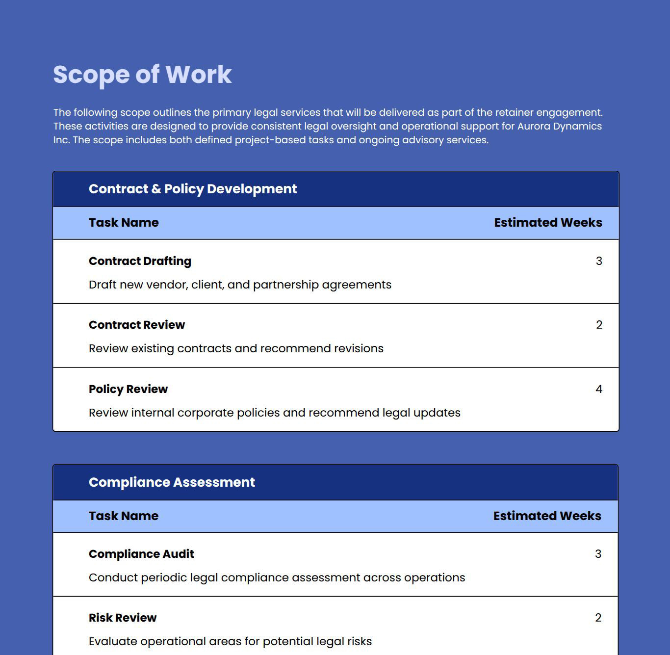 Use this proposal template to detail contract drafting scope, review process, timelines, and pricing clearly.