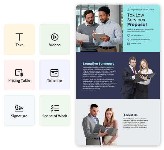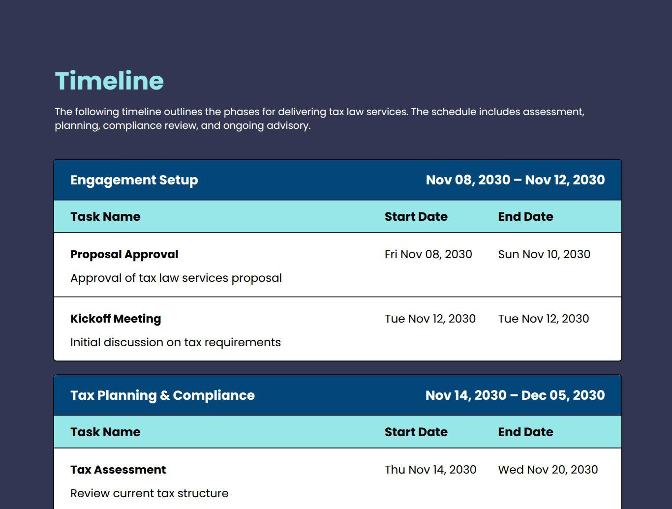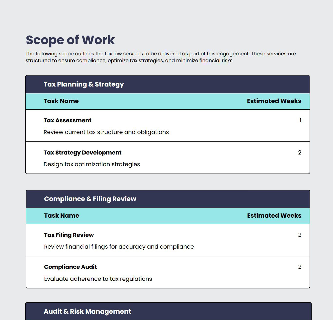 Use this tax law services proposal template to create clear, professional proposals for tax advisory and compliance. It helps you define planning strategies, filing support, regulatory scope, and pricing in a structured format. Easily customize it to fit your client’s needs and branding.
