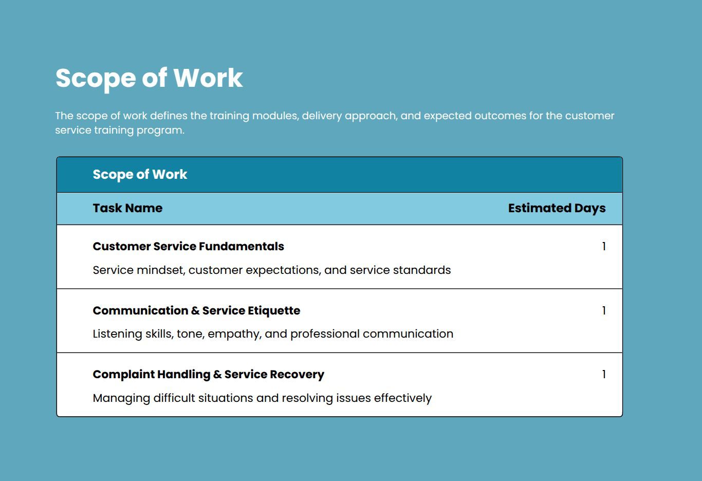 Use this customer service training proposal template to create structured proposals for service excellence programs. It helps you define training goals, skill focus areas, delivery plan, timelines, and pricing clearly. Customize sections to match client service standards and team needs.