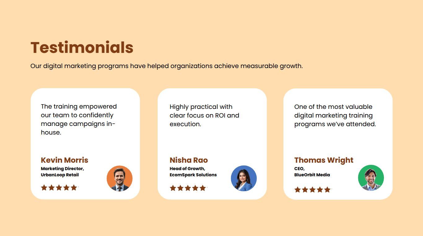 Use this digital marketing training proposal template to create professional proposals for marketing education programs. It helps you outline modules, platforms covered, learning outcomes, timelines, and pricing clearly. Customize sections to match client marketing goals.