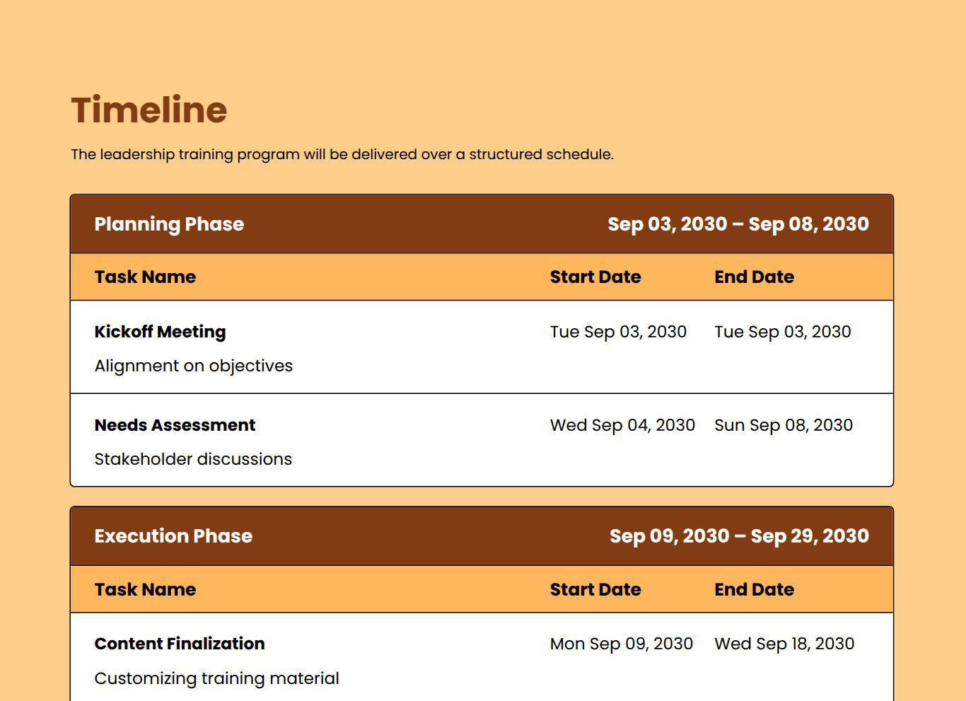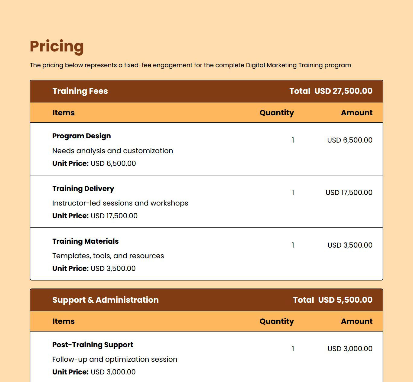 Use this proposal template to outline leadership goals, training approach, learning outcomes, timelines, and pricing clearly.