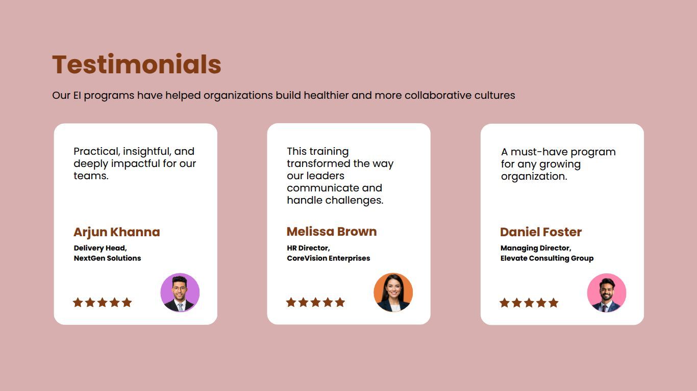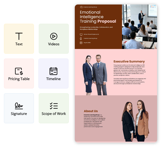 Use this emotional intelligence training proposal template to create professional proposals for EI development programs. It helps you define learning objectives, assessment methods, session structure, timelines, and pricing clearly. Easily customize sections to match client workforce needs.