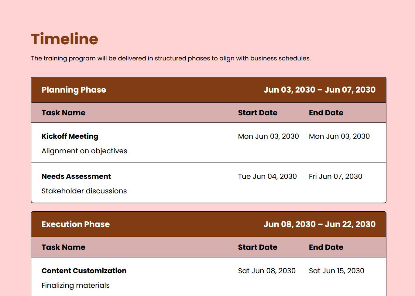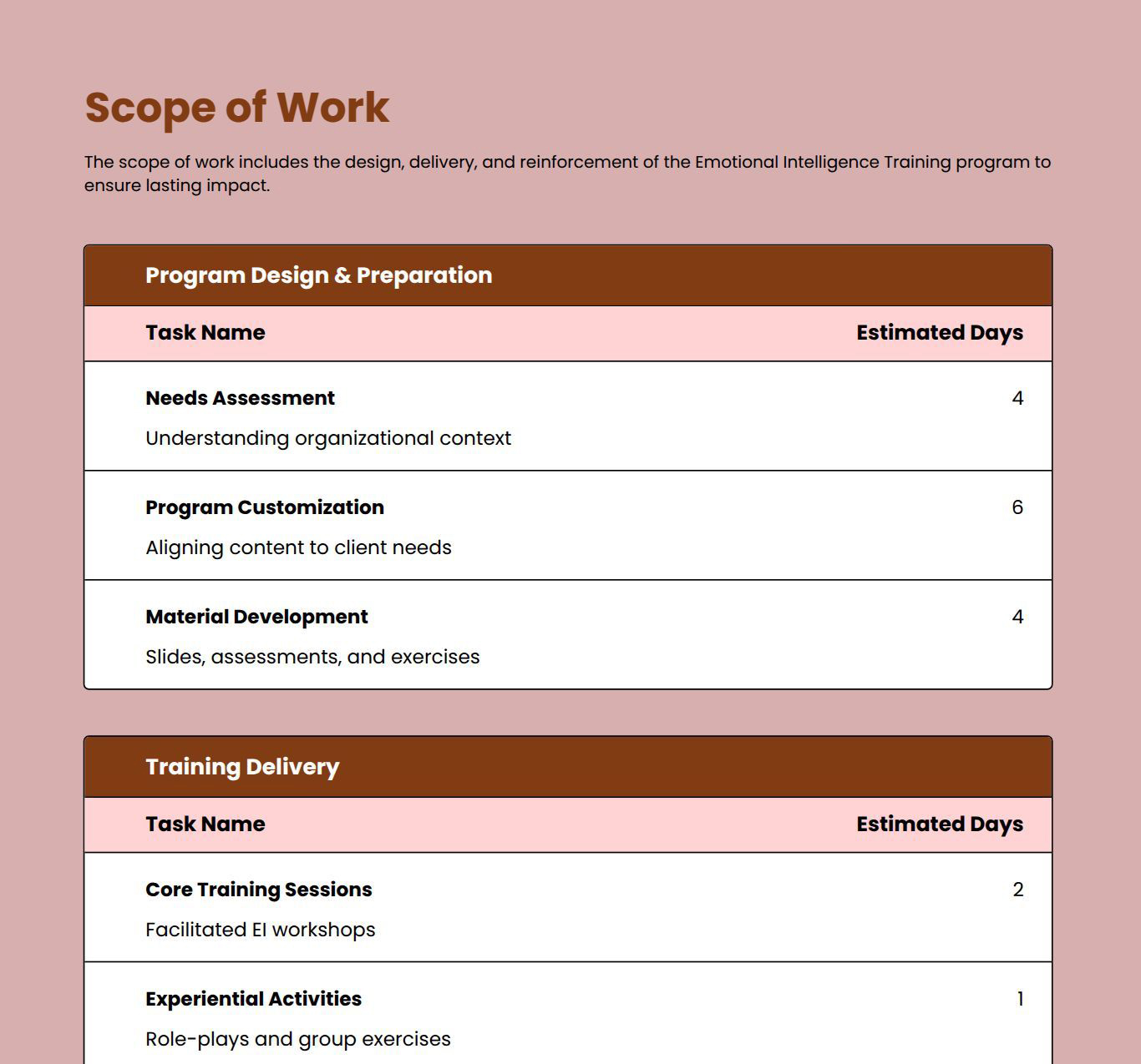 Yes, it includes sections for training scope, timelines, and pricing.