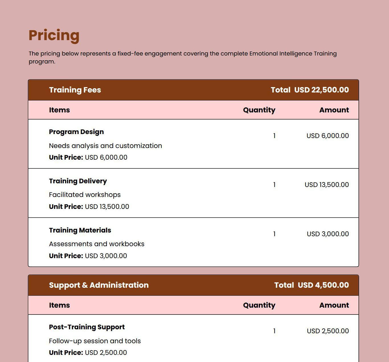 Use this proposal template to outline leadership goals, training approach, learning outcomes, timelines, and pricing clearly.