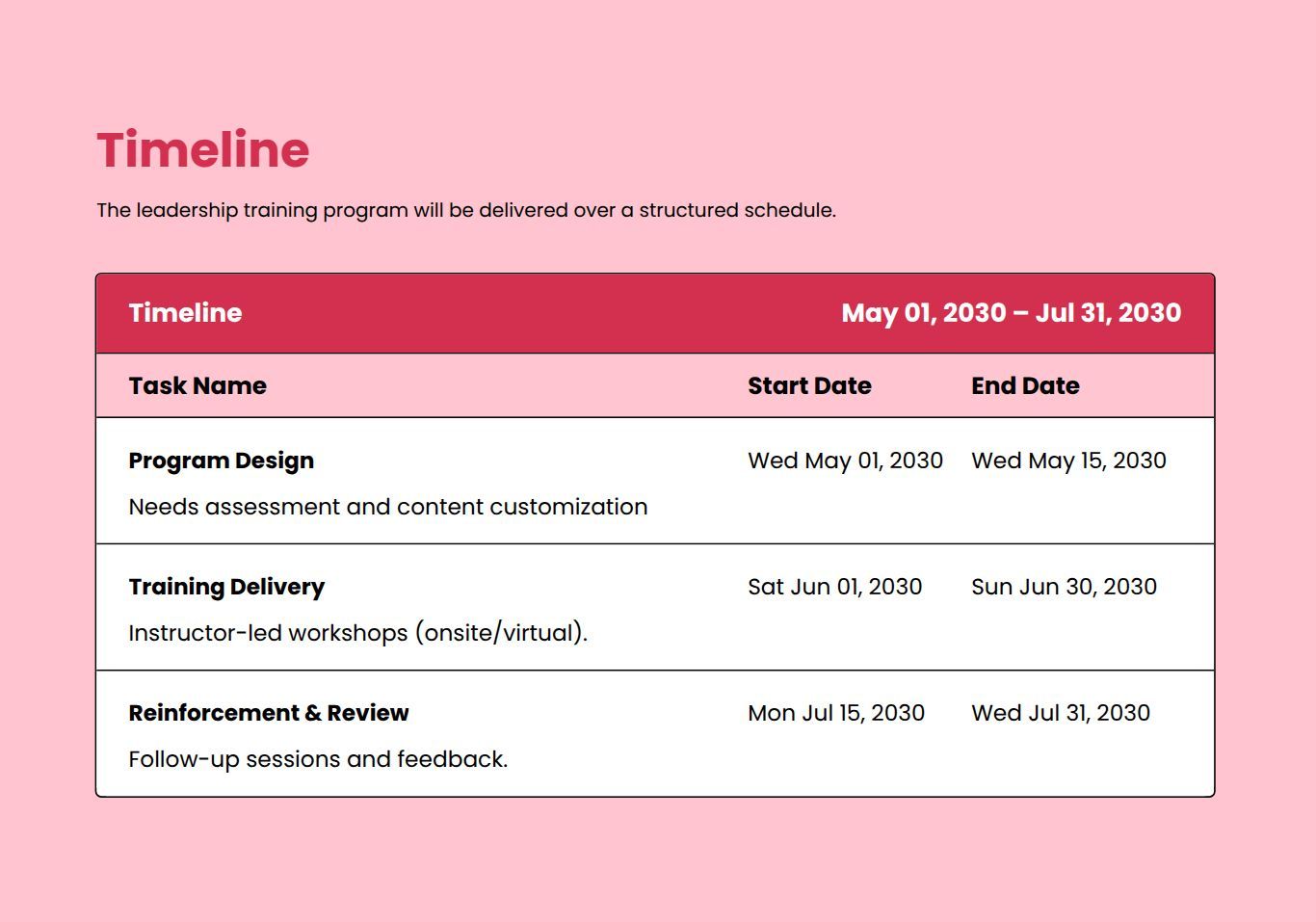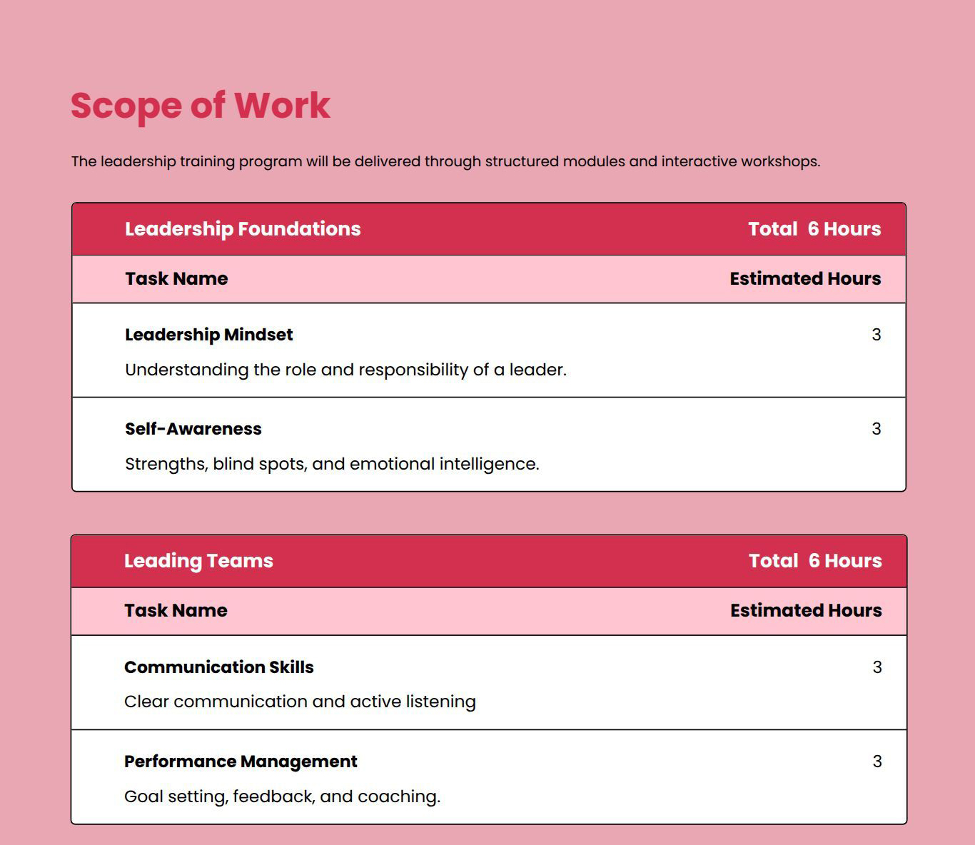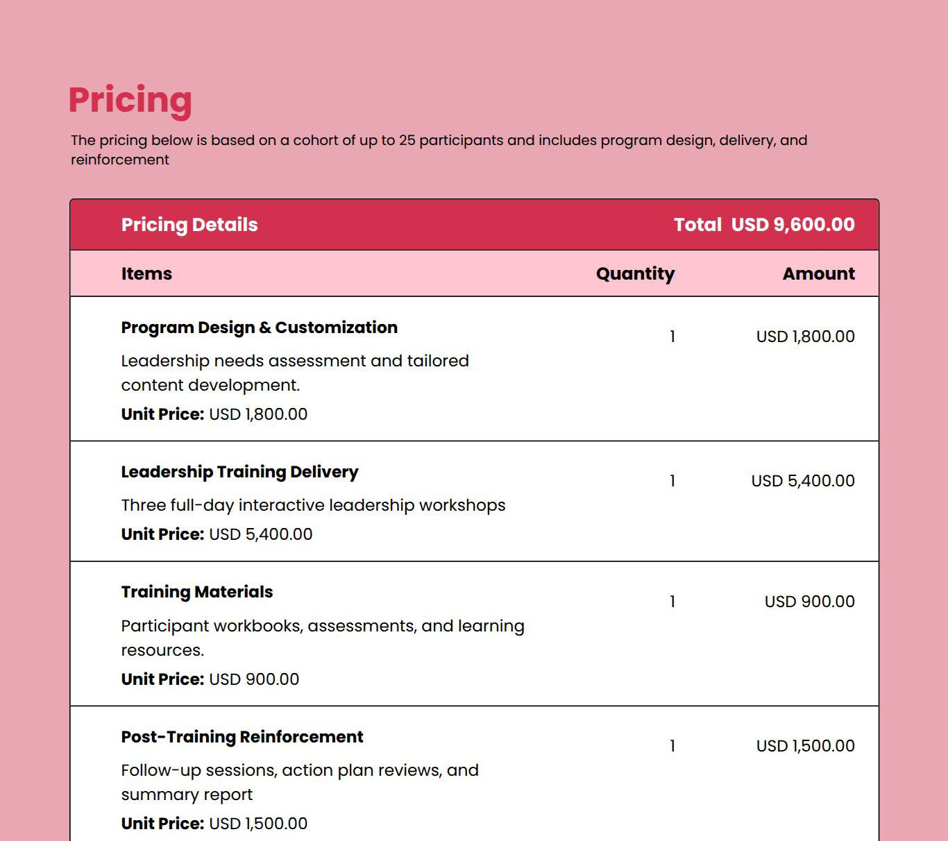 Use this leadership training proposal template to create clear, professional proposals for leadership development programs. It helps you define training objectives, session structure, learning outcomes, timelines, and pricing in a structured, client-ready format. Easily customize each section to match client goals and your training approach.