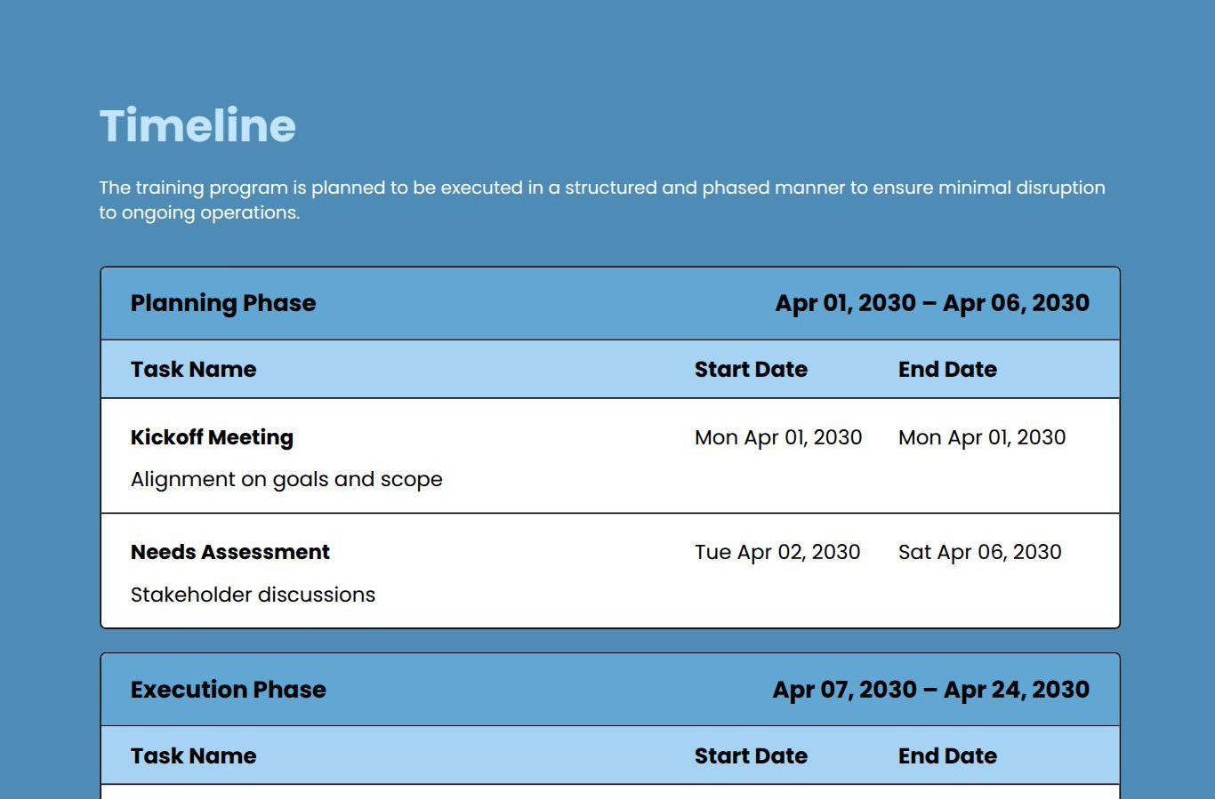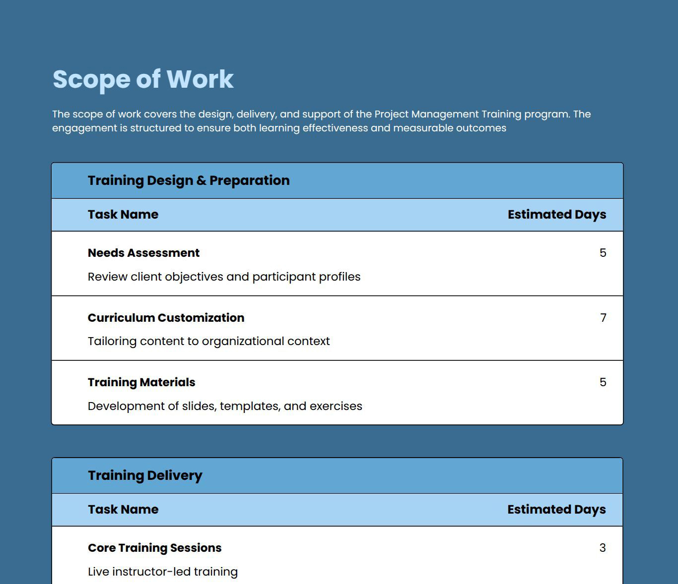 Explore more Training Proposal template examples designed for different offerings and client needs. Find the right example to match your service type and customize it quickly for your Proposals.