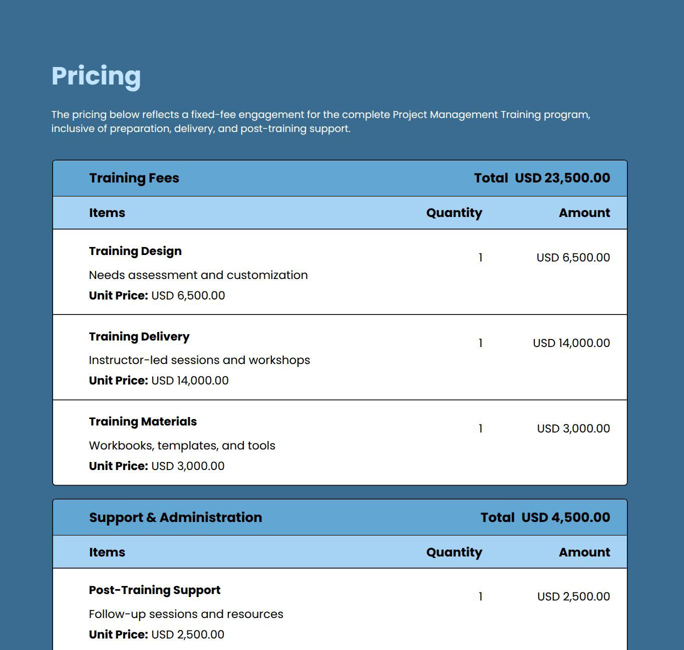 Use this project management training proposal template to create professional proposals for PM training initiatives. It helps you define learning objectives, methodology, session plan, timelines, and pricing clearly. Customize each section to align with client project frameworks and goals.